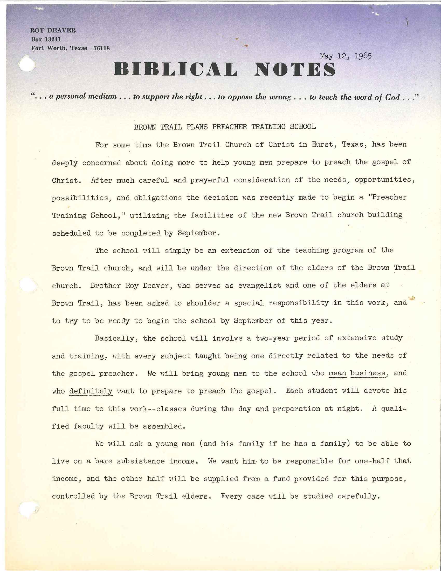 Biblical Notes was launched by Roy C. Deaver in May 1965 as a personal tool to teach the gospel. The monthly journal eventually became a quarterly, edited by Roy’s son, Mac Deaver. In March 2010 the last issue was printed and mailed to subscribers. Mac’s son, Weylan Deaver, then moved Biblical Notes to an online presence, where he serves as site administrator. Our goal is to publish content beneficial to the teaching and defense of the gospel, to the glory of God. Click on the image to see a scan of page 1 of the very first issue.